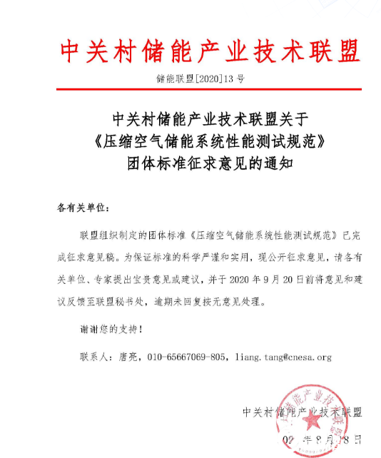 中關(guān)村儲能產(chǎn)業(yè)技術(shù)聯(lián)盟關(guān)于《壓縮空氣儲能系統(tǒng)性能測試規(guī)范》團體標準征求意見的通知