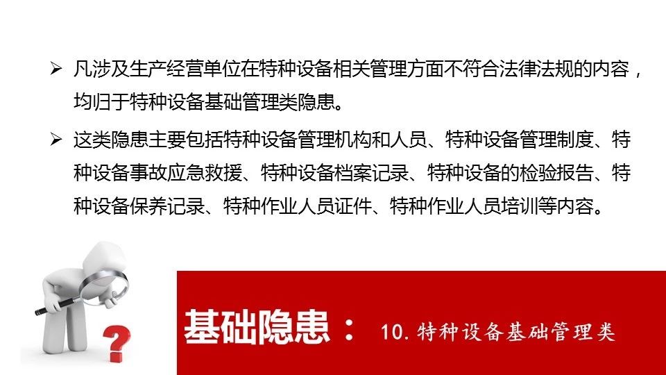 18 | 危險物品的容器、運輸工具,以及涉及人身安全、危險性較大的海洋石油開采特種設備和礦山井下特種設備未經具有專業(yè)資質的機構檢測、檢驗合格,取得安全使用證或者安全標志,投入使用的 |
