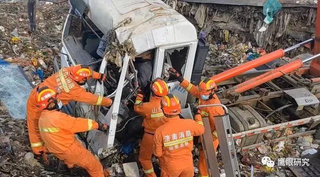 山東濟(jì)南:一垃圾車(chē)倒垃圾墜入垃圾池