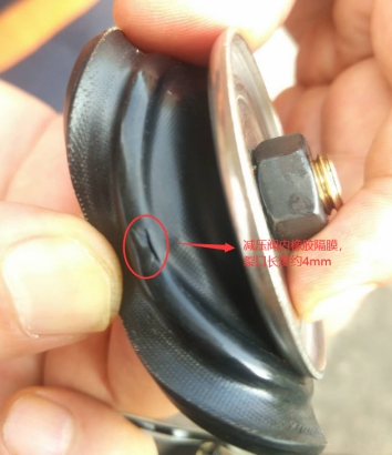 14、氣化器系統(tǒng)(含氣化器出口減壓閥)氣密性試驗情況:經(jīng)淮南市特種設(shè)備監(jiān)督檢驗中心安全閥校驗站使用0.5MPa壓縮空氣對氣化器系統(tǒng)進行氣密性試驗,發(fā)現(xiàn)減壓中間頸部呼吸孔處泄露,后拆解減壓閥,發(fā)現(xiàn)該減壓閥內(nèi)橡膠隔膜破損,高壓側(cè)氣體直接通過破損的橡膠隔膜排出。