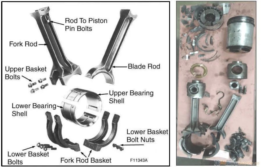 在檢查中,工程師發(fā)現(xiàn)6號(hào)曲柄銷(xiāo)(用于6號(hào)和14號(hào)氣缸)的連桿和活塞處于“完全損壞狀態(tài)”。在油底殼中發(fā)現(xiàn)曲柄總成托架的一個(gè)完整螺栓,同時(shí)在另外一處發(fā)現(xiàn)了緊固螺母,這證明螺栓和螺母是在運(yùn)行過(guò)程中脫落的??偝傻钠渌菟ň捎诶爝^(guò)度而發(fā)生變形及斷裂。